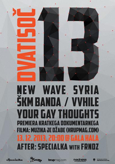 Prihaja dvatisoč13, že tretja izdaja večernega prereza glasbenega leta! Koledar nam je ob tej priložnosti naklonil petek trinajstega, skozi katerega nas bo peljala razgibana, raznolika, a smiselno nanizana četverica vrhunskih nastopajočih – ŠKM banda, New Wave Syria, VVhile in Your Gay Thoughts. Tri domače in ena beograjska zasedba sestavljajo le košček domačega in širše lokalnega glasbenega mozaika počasi poslavljajočega leta. Pravzaprav kar dve zasedbi na dogodku predstavljata nov material – glasbo, ki jo bomo v zvočnem zapisu lahko uživali leta 2014.