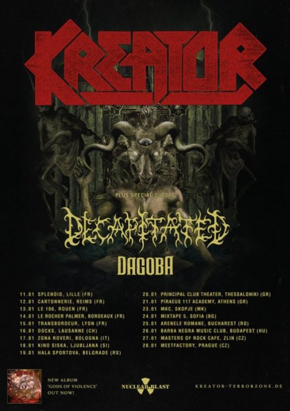 Na koncertu, ki se bo odvil 18. januarja 2018, bodo pred Kreator, ki bodo promovirali letošnji album »Gods of Violence«, nastopili še poljski death metalci Decapitated, ki so letos izdali novi album »Anticult« ter francoski groove metalci Dagoba.