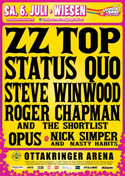 Seznam nastopajočih na avstrijskem festivalu klasičnega rocka Lovely Days je dopolnjen! Teksaškim boogie rock prvakom ZZ Top in britanskemu kvartetu Status Quo so organizatorji v pretklih mesecih dodelili družbo kot vedno eminentnih imen starega blues in rocka.