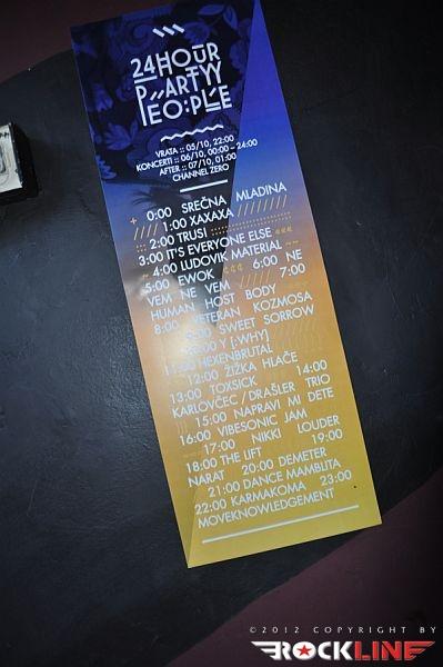 Kaj je to »24 Hour Party People«? 24 ur neprestanega koncertiranja 24 zasedb? 24 ur neprenehnega glasbenega transa? 24-urni presek slovenske alternativne glasbene scene in vseh biserov, ki jih skriva? Edinstven dogodek v Evropi, morda pa celo na svetu? Dejansko je bil in je »24 Hour Party People« vse to. 24 zasedb v 24 urah. 24 ur edinstvenega dogodka v Evropi. 24 ur za dokaz slovenski publiki. 24 ur za Slovenijo in njeno glasbeno zakrknjenost, da se iz le-te izvije in pokaže, da glasba tu še vedno nekaj pomeni.