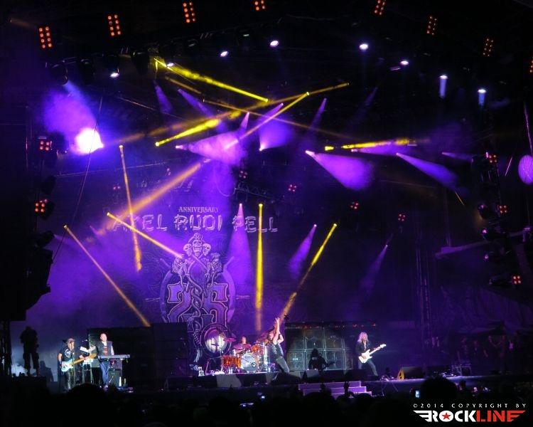 Na oder se vrne Volker Krawczak na bas kitari, za bobne sede Jörg Michael (ex-Saxon, ex-Stratovarius, ex-Running Wild, ex-.Rage, ex-Grave Digger) , za mikrofon pa poprime znameniti Rob Rock (solo, Impelllitteri), na odru pa dobimo tako inkarnacijo prve postave A.R.P. banda, ki nadaljuje šov s skladbo Nasty Reputation. Kaj hitro se je izkazalo, da je Rock, ki je nastopal kot Rob rock drugega dne letošnjega festivala. še vedno v izvrstni vokalni formi, prav tako pa tudi to, da Axel ni kdo ve kako vešč odrskega nastopaštva. Tudi v nekaj skromnih trenutkih šova, ko je stopil za mikrofon, da spregovori nekaj besed. Zato je zelo rad od vselej te vloge v širokem obsegu prepuščal pevcem svoje zasedbe. Rudi je pomaknjen na desno stran odra med nastopom miroljubno soliral in ni izražal kakšne pretirane želje po skakljanju širom odra in vzbujanju pozornosti. Vendar pa se je moral tega večera ubadati naš, v svileni srajčki baročno okrancljani, trubadur Rudi z drugimi zadevami, ki jih ni načrtoval. Skozi prvi del koncerta se je moral ukvarjati najmanj polovico nastopa z zvočnimi inženirji, da popravijo zvok kitar. Kot ste opazili že prej, je v reportaži zapisana ugotovitev o slabih zvočnih razmerah preko prvega dne festivala, za kar je zagotovo kriva letošnja izbira glavnih zvočnih inženirjev festivala. No, ker pa je Axel Rudi Pell perfekcionist in to za povrhu zelo trmoglav, se je njegova vztrajnost korenito poplačala. Zvok se je naposled uredil in kitare so »prijele« kot se šika. Šlo je namreč za jubilejni dogodek, ki je bil tudi podprt z multiplo rabo kamer, kar je pomenilo, da se koncert snema. Axel Rudi Pell je v dneh po tem koncertu tudi uradno potrdil izid novega koncertnega dokumenta s tega nastopa in sicer v obliki Blu-ray. dvojnega koncertnega CDja in DVDja. Torej je upravičeno »norel« in demonstriral pri zvočnih tehnikih.