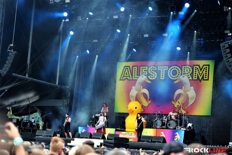 Škoti Alestorm so povzročili kreposten zasuk na prizorišču festivala. Imajo krepko bero privržencev. Vendar reč ni primerljiva s tistim, kar denimo spravijo iz publike Alestorm na nastopih v Tolminu (Metaldays festival). Nekoliko starejša klientela le prednjači na Bang Your Headu!!!, zato ni bilo toliko vratolomnih kamikaz, vsekakor tudi brez napihnjenih rekvizitov, z izjemo kakšnega meča, ali sekire,.. Čeprav so prav Alestorm z napihnjeno raco prenesli del Tolminske folklore na svojo aktualno in novo turnejo »No Grave But Sea«. V bistvu je bend postal precej samoparodičen, vendar pa njihova mestoma že prav bizarna zafrkljivost, nenehno vžiga. In v tem se pač Alestorm ne brzdajo, saj jim to prinaša vedno nove in nove privržence. V ozadju odrskih kulis se nahaja transparent z bananama iz katere pa kukata gosji glavi. Njihova »pijanska« ekspedicija na Balingen, je tokrat dostavila repertoar s skladbami: Keelhauled, Alestorm, Mexico, The Sunk'n Norwegian, Nancy the Tavern Wench, Rumpelkombo, Hangover, Captain Morgan's Revenge, Drink in Fucked With an Anchor. Kliše power metal z občasnimi folk ornamenti, je okrepil prodajo piva na prizorišču. So pa Alestorm resnično nebrzdani. Vrata so jim povsod odprta, posedujejo izredno kilometrino in zatega izkušnje. Sploh kar se obvladovanja odrov tiče. Figura vodje in pevca Christopherja Bowesa, ki sicer igra klaviature pri GloryHammer, ostaja sama po sebi, prvi naslov, ki te spravlja v prešerni smeh. Mož je vzbujal pozornost tudi z belo majico na kateri je zapisano: »I Got Lost in the Gay Dolphin«, sicer pa dražil vedno znova s klaviaturami tipa »Modern Talking«, ki pa ga vseeno občasno prav toliko ovirajo, da med petjem rad zgreši kak ton, pa tudi včasih zdrkne iz idealne vokalne linije. Vendar to ni važno. To je namreč del »folklore« skupine in tako mora biti. V letu 2018 deluje, kot da skupini ne more iti prav nič po zlu. Jezdijo na orjaških valovih in se vzpenjajo še više. To so potrdili deset dni kasneje, ko so nastopili na Metaldays festivalu v slovenskem Tolminu.