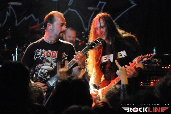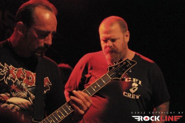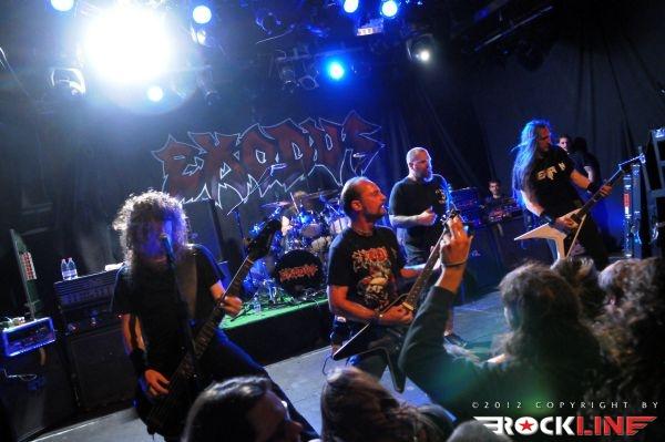 Exodus so zadnje čase zelo pogosti obiskovalci naših domačih logov. Tale obisk je pravzaprav podaljšek skupnega druženja Heathen in Exodus v decembru 2011. Exodus, ki so nastopali kot glavni nosilci večera, so imeli na razpolago dobro uro in pol igralnega časa. Le ti, pa za razliko do kolegov Heathen, v set listo niso vrnili aktualnega albuma. Še več. Ostali so pr repertoarju samih kultnih klasik, ki so jim dodali tudi štiri točke fantastičnega povratniškega albuma iz leta 2002 »Tempo of the Damned«. Pa čeprav bi človek upravičeno pričakoval promocijo albuma »Exhibit B: The Human Condition« (2010). Da so ljubitelji njihove glasbe seveda nepovratno in prvovrstno zaljubljeni v stare kultne klasične albume, je dejstvo. 70% albuma »Bonded By Blood« s Piranho, A Lesson In Violence, And Then There Were None, Metal Command, Strike of the Beast in Bonded By Blood! Želi kdo več? Že samo to zadošča. Poleg tega so navrgli še »Pleasures of the Flesh« klasiki (naslovna skladba, Brain Dead) in standard The Toxic Waltz iz albuma »Faboluos Disaster« in zmaga je z velikim naskokom, več kot zagotovljena. Od novih skladb se je na set listi znašla le Iconoclasm (»Atrocity Exhibition… Exhibit A«, 2007).