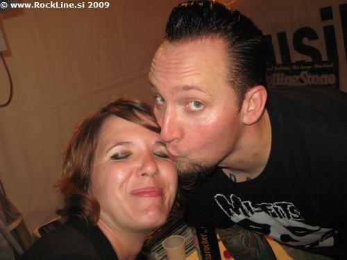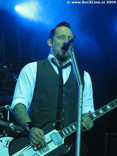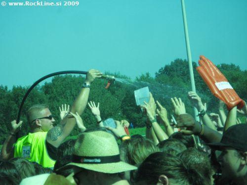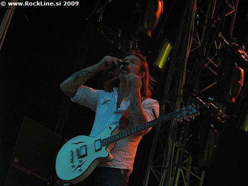 Volbeat so naši stari znanci. Zunaj imajo dva studijska izdelka, slednji "Guitar Gangsters And Cadillac Blood", pa še vedno ohranja vso aktualnost masivne promocije skupine. Po marčevski turneji, skupina izkorišča poletje za pojavljanje na nekaterih evropskih festivalih. Gre za silno zanimivo dansko zasedbo, ki izmed novejših zasedb ponuja edinstveno kompatibilen čelni trk prvin heavy metala s tradicionalnimi rockabilly vzvodi. Če bi od glave do pete potetovirani Kerry King iz zasedbe Slayer še nosil kakšen las na glavi, bi si ga moral le z briljantino pogladiti po vzoru najslavnejše Elvisove pričeske in na odru bi stal Michael Poulsen. Ta k sreči še premore nekaj las, da to lahko počne, prednje ekstremitete pa je že davno tega preoblekel v krepko tetovažo. Bela srajca z zavihanimi rokavi, da se vidi umetnost tatooja, preko srajce telovnik za blagor spomina na zlata petdeseta. Skupina razsaja na odru neusmiljeno hrupno in žgoče. Poulsen z vokalom basira namerno v slogu kakega Presleya in mestoma celo predirljivo zahlipa, po vzoru preminulega kralja rock n' rolla. Skupina se pridno oklepa zvoka polakustičnih Gibson kitar, seveda krepko priklopljenih na hrupno distorzijo, ko se valijo Guitar Gangster And Cadillac Blood, pa Hallelujah Goat, Radio Girl, Sad Man's Tongue, Mr. & Mrs. Ness,... Volbeat so vključili v nastop celo Misfits priredbo Angelfuck, saj je Poulsen velik oboževalec te skupine. Skupina je žal nastopila istočasno kot Eagles Of Death Metal na Race Stageu, tako da je bila odločitev to pot zares težka, kateri skupini bi posvetil pozornost, pa vseeno so Volbeat, kot vzhajajoče zvezde kanček bolj aktualne, že zavoljo dejstva, da danes v rocku ne najdeš niti ene same samcate skupine, ki bi ji bila zvočno in slogovno vsaj malo podobna. Pod odrom je rajala s skupino masa 30.000 podivjanih žrebcev in žrebčevk, kar je bil neposreden dokaz, da gre za silno priljubljeno skupino med mladimi. Volbeat pa ob tem niso cenen bend. To je skupina ki priredi nepozabno veselico, po kateri ostane vonj izgorevanja bencina iz Zippo vžigalnikov, v vaših nosnicah zapečaten še lep čas potem! Volbeat so s svojim izdelanim, vrhunsko uigranim in visoko karizmatičnim šovom vrgli rokavico najstniškim idolom in punk rockerjem Rise Against ter jih prisilili do tega, da kot naslednji na zelenem odru, nikakor ne smejo varčevati z zalogami energije!