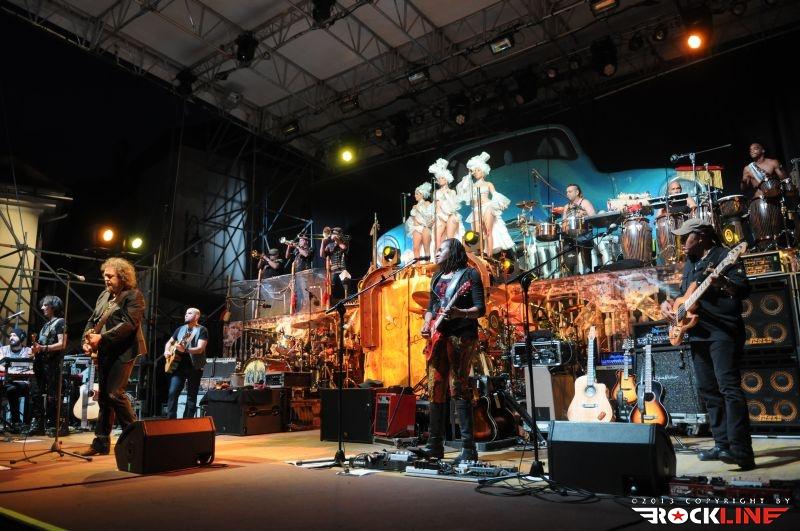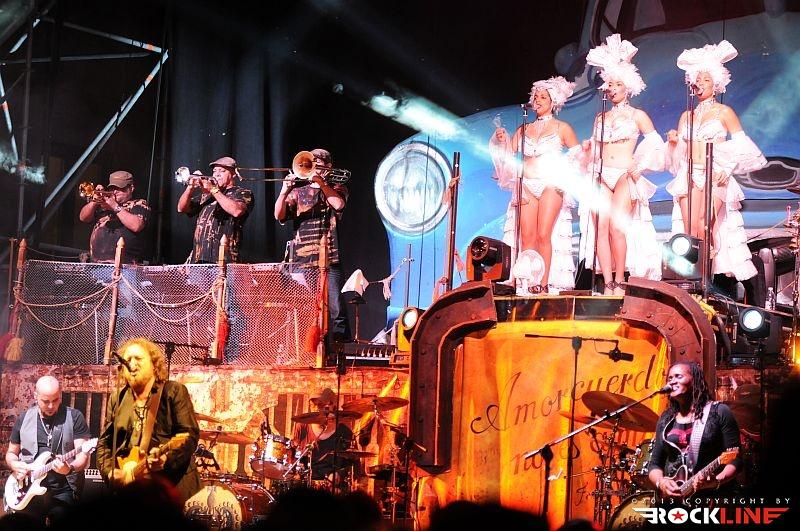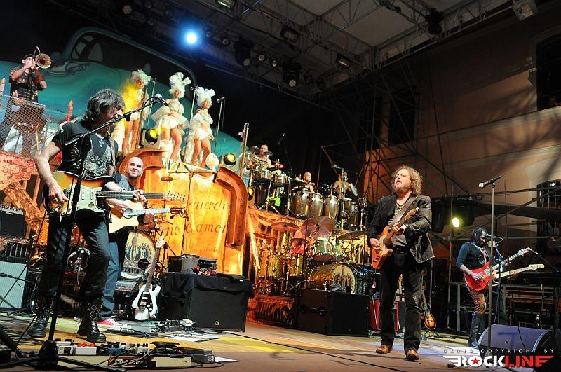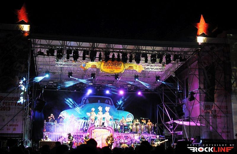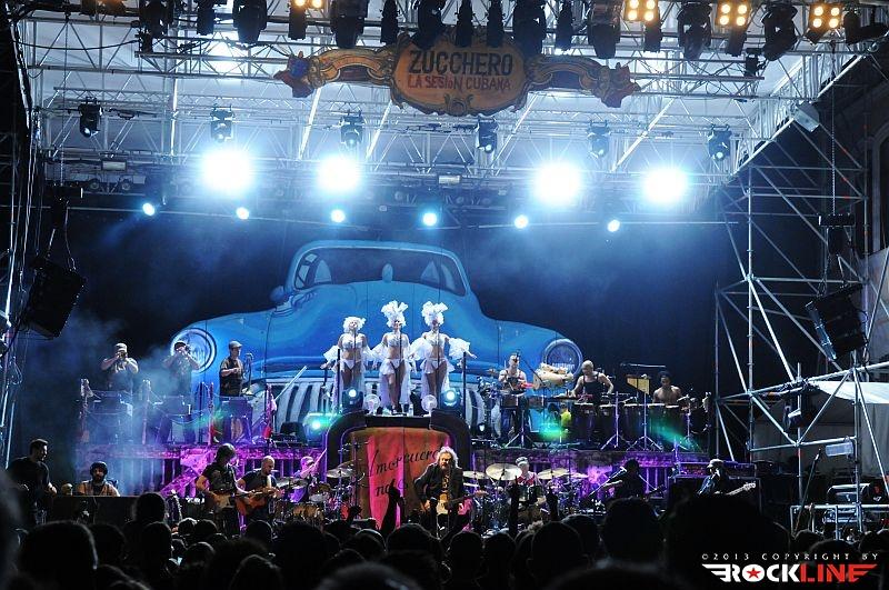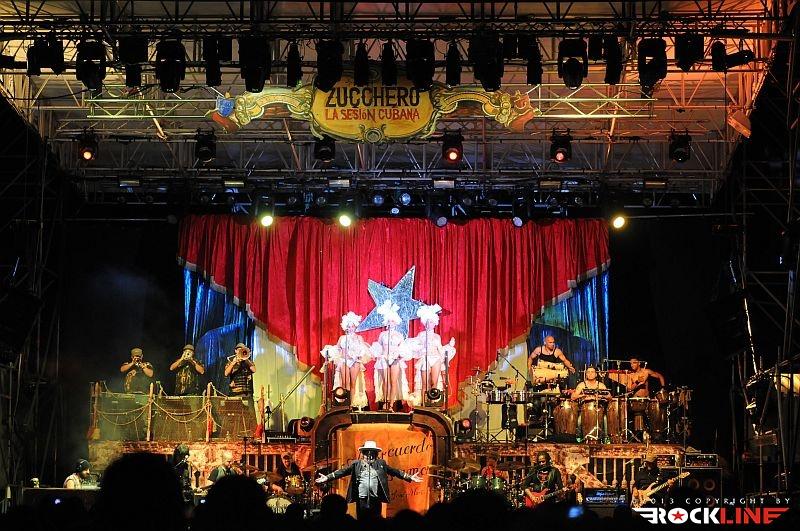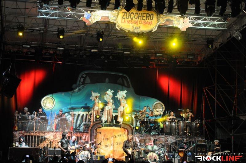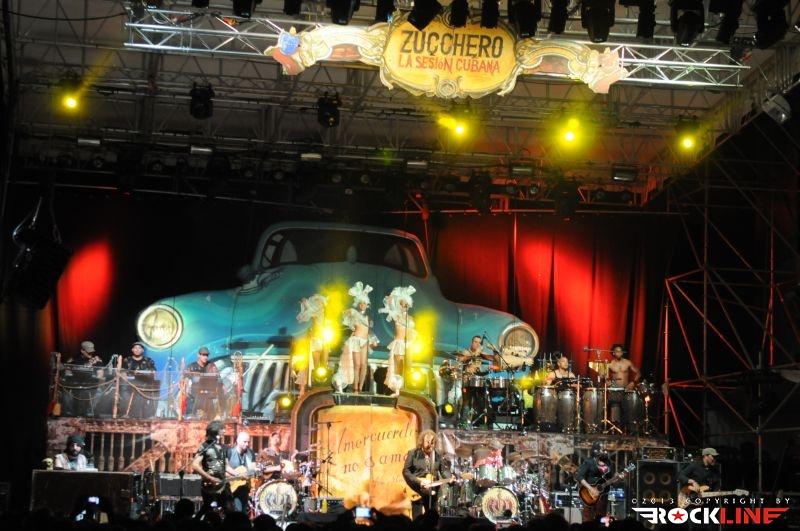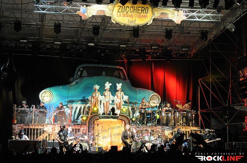 Lepa uvertura v srečanje s Zuccherom, mar ne? Zucchero je danes tako velik in močan glasbenik, da si lahko omisli na odru prav vsakršno produkcijo. Tudi hiper-produkcijo. Njegova aktualna ljubezen, ki ga po novem veže na Kubo in vse kar je povezano s to deželo, kjer Američanom še ni uspelo vsiliti svoje, za svet pogubne tiranije bogatenja peščice na račun večine Zemljanov, je dobila utelešenje v aktualni studijski izdaji »La sesion Cubana« (2013) – RockLine recenzija TUKAJ. Za Zucchera torej ni ovir. S svojim zaslužkom si lahko privošči vse. Realizacijo sleherne ideje. Tako je za turnejo »La sesion Cubana«, ki se je pričela v Avstraliji v začetku letošnjega aprila ter po seriji razprodanih koncertov v juniju letos dosegla tudi rodno Italijo, na odru zbral (z njim vred) reci in piši pravi pravcati garnizon sedemnajstih glasbenikov. Poleg Zucchera, ki je pel in igral kitaro, so to: basist Polo James, kitaristka, spremljevalna vokalistka in solo vokalistka Kat Dyson, kitarista Mario Schilirò ter Elmer Ferrer, bobnarja Adriano Molinari in Horacio Hernandez, klaviaturist Nicola Peruch, kubanski tolkalisti Joaquin Nunez Hidalgo, Jorge Luis Nunez in Karel Escalona, kubanska pihalna sekcija v sestavi Lazaro Amauri (trobenta), Osmil Rene’ (trobenta), Maykel Fernando (pozavna) ter mično jedre spremljevalne vokalistke prav tako kubanskega porekla Dorian Carol, Dyalis De Regla ter Liuba Calvo!
