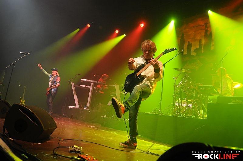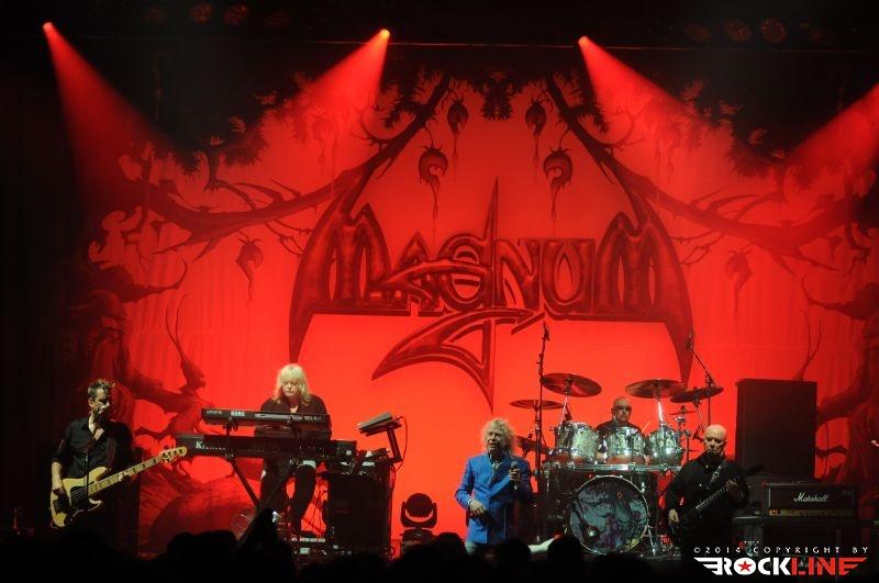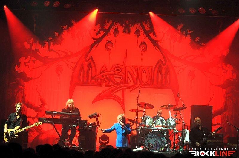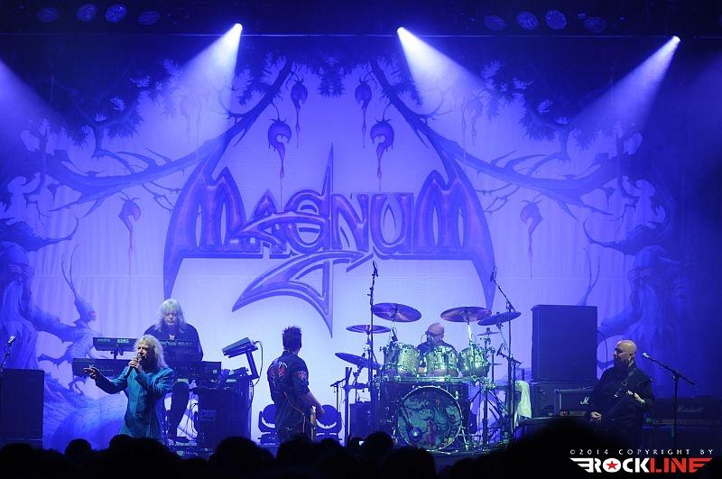 Angleži Magnum, ki so v tem večeru nastopili prvi, so na tej turneji predstavljali svoj najnovejši studijski dosežek z naslovom »Escape From the Shadow Garden« (2014), kar pomeni da je bil njihov koncertni repertoar večinoma zaznamovan s skladbami z omenjenega albuma. V prvi polovici nastopa so torej prevladovale izvedbe nekaterih favoritov iz obdobja med letoma 2009 in 2014, medtem ko so dolgoletne klasike prišle na vrsto šele na polovici. Magnum so svoj nastop odprli z »Live 'til You Die«, otvoritveno skladbo z novega albuma in že takoj potrdili sijajno uigranost med posameznimi inštrumentalisti, kar vse dobre poznavalce njihovega odrskega pristopa ni niti najmanj presenetilo. Vselej resni, če že ne skorajda strogi kitarist in glavni skladatelj Tony Clarkin je vseskozi ohranjal statično odrsko držo, medtem ko je bilo njegovo pestro ubiranje kitarskih fraz vnovič prava paša za ušesa. Dolgoletni klaviaturist Mark Stanway je, kljub temu da so njegovi podočnjaki z vsakim letom nekoliko težji, pridno gradil mogočne simfonične aranžmaje in bil pogostokrat ključni faktor značilne Magnum epskosti in pompoznosti.