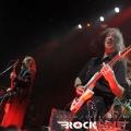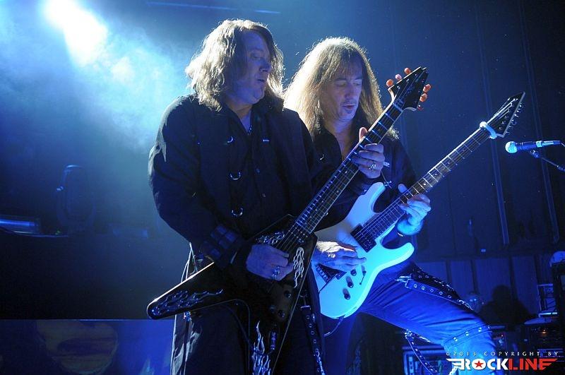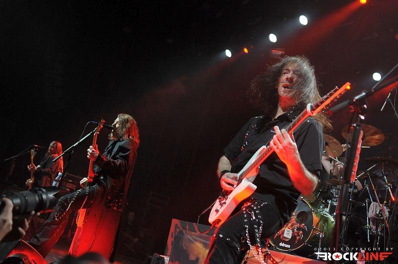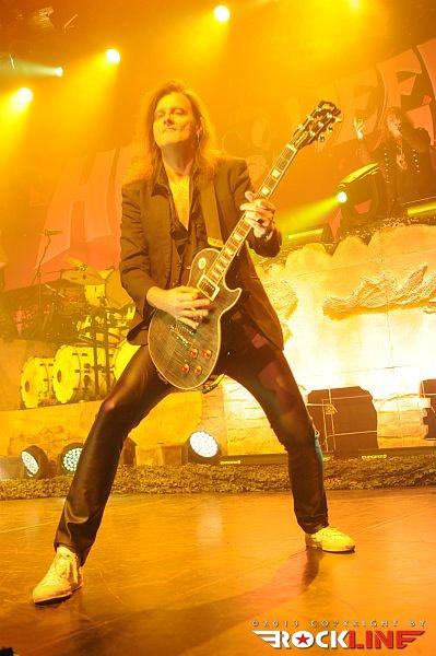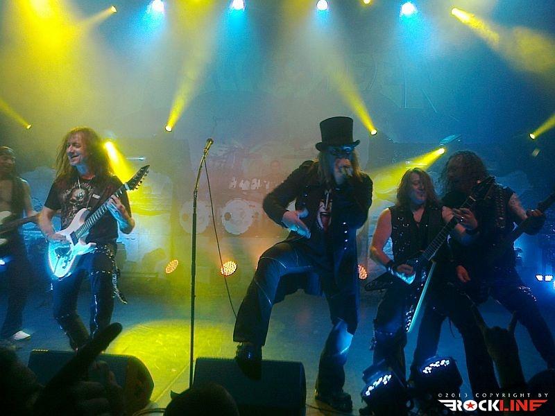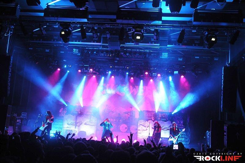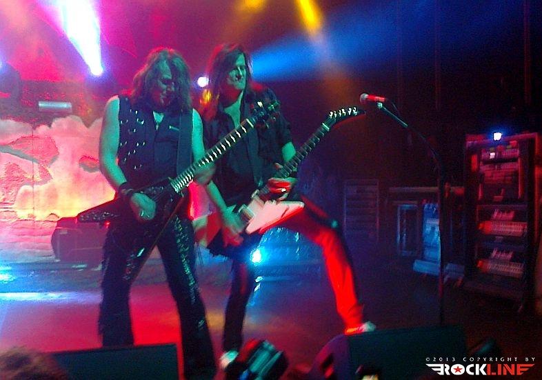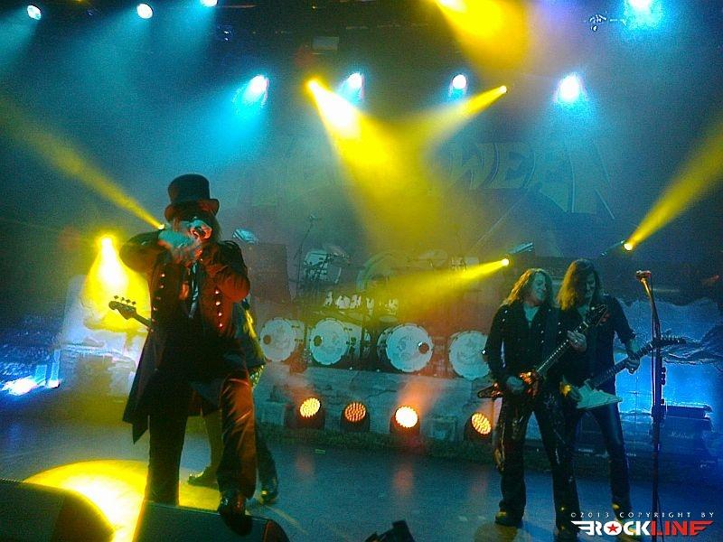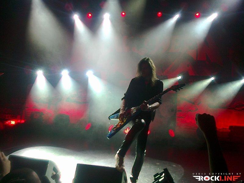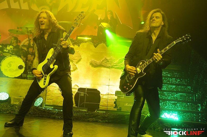 Veterani Helloween so po pol ure priprav na oder stopili na moč pompozno. Obvezna AC/DC himna »For Those About To Rock (We Salute You)« se je prevesila v živo izvedeni »intro« »Wanna Be God«, Bučkarji pa so na oder stopili izza maskirne zavese. Postapokaliptično razrušeni oder, okrašen z bučami, skritimi za plinskimi maskami, je napovedoval, da bodo bučkarski soldati vladarji novega sveta, Helloween pa so nas kljub temu za začetek pahnili v fantazijski svet s prvim singlom nove plošče Straight Out of Hell (RockLine recenzija TUKAJ), »Nabatea«. Ta je z epskim »darkridish« občutkom v živo prepričal še bolj kot na plošči, in prav škoda je, da so izjemno obetaven začetek Helloween v nadaljevanju nekoliko zagrenili z neposrečeno izbranim repertoarjem. S povprečnega aktualnega izdelka smo tako dobili kar pet komadov, žal ravno tistih, ki ne segajo med boljše. Namesto »Live Now!« in dolgočasne balade »Hold Me In Your Arms« bi bila mnogo boljši izbor na primer »Burning Sun« ali »World of War«. A Helloween so kljub temu z levim mezincem publiko dvignili v zrak že na samem začetku z odlično izvedbo večne klasike »Eagle Fly Free«. Tu gre poudariti, da se je zelo suvereno ves večer držal Andi Deris, čigar vokal je znal v preteklosti razočarati. Tokrat je šlo kot po maslu, pa čeprav mu je pri najvišjih krikih večkrat pomagala mešalka, a dovolj pove to, da se je zadovoljivo izmazal tudi s komadi Kiske ere. V nadaljevanju je kljub vrhunski izvedbi, dobremu zvoku in vedno razpoloženima Markusom Grosskopfom in Michaelom Weikathom (njune poteze, poze in utrgane grimase ne pustijo ravnodušnega prav nikogar) energijo nekoliko umirila 7 Sinners skladba »Where the Sinners Go« ter novotarija »Waiting For the Thunder«, a sledil je prvi vrhunec večera, Time of the Oath jekleni mučilec »Steel Tormentor«, ki ga je uničil le nepotrebni in brezvezni bobnarski solo Danija Löbleja, ki po novem sedi za trdnjavo s kar štirimi bas bobni. Povsem nepotrebno in pretirano pozersko. Okus je k sreči popravil Weikijev »I'm Alive« ter neverjetni »Falling Higher«. Prav škoda je, da Helloween devetdesetih ostajajo tako spregledani. Derisu so komadi jasno pisani na kožo, material z odličnega trojčka Master of the Rings-The Time of the Oath-Better Than Raw pa ostaja nekaj najboljšega, kar se je v devetdesetih pripetilo heavy metalu, in po krivici spregledano obdobje. Po tej plati so Helloween mnogo bolj navdušili na prvi ediciji Hellish Rock turneje. Vendarle pa si prehudega očitanja Helloween ne zaslužijo, saj navdušijo predvsem z energično izvedbo, simpatično odrsko pojavo, to pot pa se je zelo dobro izkazal predvsem Deris s Kiss majico in oponašanjem Gena Simmonsa, še bolj pa s tem, da med »Power« ni v neskončnost nategoval občinstva s prežvečenimi forami. V prvem dodatku so Helloween zažgali z nalezljivim hitom »Dr. Stein«, najtežje pričakovan trenutek pa je bil brez dvoma zaključek, pri katerem se je svojim starim kolegom, bolje rečeno Markusu in Weikiju, znova pridružil Kai Hansen. Fantje so vrhunsko odžgali venček večnih Halloween (škoda, da ne v celoti, tako kot na prvi turneji), še mnogo bolj pa je navdušil povratek na prvenec Walls of Jericho s »How Many Tears« in »Heavy Metal (Is the Law)«. Neverjetna izvedba predvsem po zaslugi fantastičnega Kaia, ki je mravljince povzročil predvsem, ko je stopil ob bok Weikiju in sta postregla s fenomenalno odigranimi harmonijami. Še poslednji in brez dvoma vrhunski trenutek pa je predstavljal zaključek z verjetno največjim hitom nemškega metala, »I Want Out«, pri katerem so se Helloween na odru pridružili še Gamma Ray (z izjemo bobnarja Michaela). Izvedba je publiko dvignila v ekstazo, zmotilo je morda le predolgo nategovanje z »I Want Out«, a je prizor Kaia ob boku Markusa in Weikija odtehtal vse morebitne pomanjkljivosti.