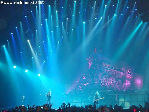 Po kratkem animiranem filmu je eksplozija najavila divjo zabavo. Na oder so privihrali gospodje in padli v peklenski ritem skladbe Rock And Roll Train. Velika scena je vsebovala velik oder, ki se je v delu zajedal v parter, velik video zaslon, dva manjša na straneh ter grozde velikih zvočnikov. Hard rockovska glasba prinaša glasne koncerte, tokrat je bila jakost ravno prava, poleg tega so bili vsi inštrumenti in glasovi zelo jasni in neposredni. Malo manj kot dveurni nastop je postregel z množico uspešnic, plošči Black Ice so namenili štiri skladbe, kar ne preseneča. Iz zakladnice štirinajstih studijskih plošč z množico je težko izbrati dovolj preverjenih uspešnic in obenem predstaviti novosti. Ac/Dc so bili pri tem uspešni, saj so odigrali glavne skladbe iz celotne kariere. Manjkala ni niti njihova ustaljena scenografija, ki je prišla do izraza predvsem pri skladbah T.N.T., Whole Lotta Rosie, Hells Bells in For Those About To Rock. Na sredini velikega odra je imel delovno mesto bobnar Phil Rudd, ob njem sta bila basist Cliff Williams in ritem kitarist Malcolm Young. Oba sta se med nastopom komajda premaknila, največkrat le, kadar sta pomagala pri petju. Tako je glavnina odra ostala rezervirana za pevca Briana in kitarista Angusa. Brian Johnson se za svojih enainšestdeset križev drži presenetljivo dobro, malo zraka mu je zmanjkovalo le proti koncu nastopa. Prav neverjetno pa je, od kod jemlje drobni Angus energijo. Ta triinpetdesetletnik je živ ogenj. Po odru se podi, skače, zvija, valja in plazi po kolenih kot kakšen najstnik. Ob vsem tem še prepričljivo igra kitaro, lahko rečem, da večina odrske predstave temelji prav na njegovih ekshibicijah. Ac/Dc v Milanu razen bluesovske The Jack v glasbeni hitrosti niso popustili ni ti za minuto. Od prvega tona naprej je občinstvo z njimi dihalo, skakalo in prepevalo kot eden. Tako predanega občinstva ne srečam pogosto. Vsakdo menda v nekaj veruje, Ac/Dc imajo neverjetno množico predanih vernikov. Za zaključek so izbrali Highway to Hell in nepogrešljivo, s topovskimi detonacijami podkrepljeno For Those About To Rock We Salute You.