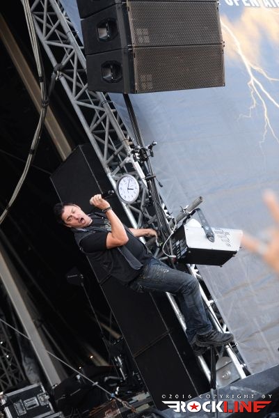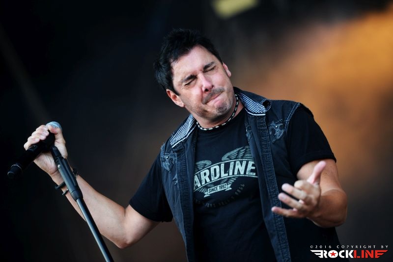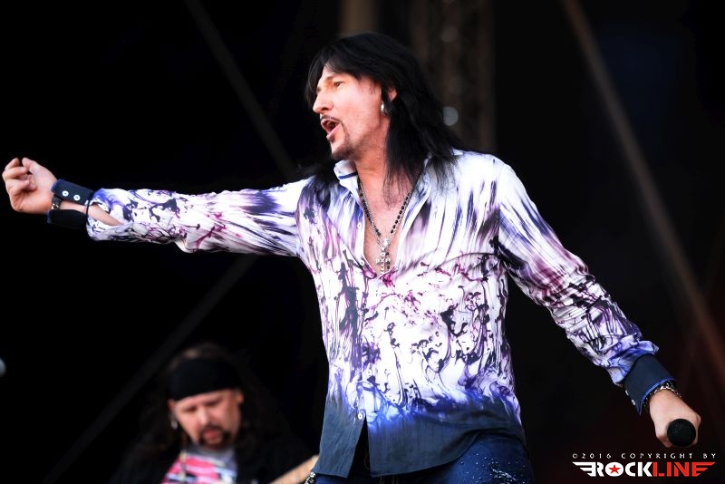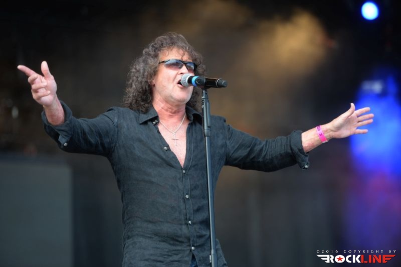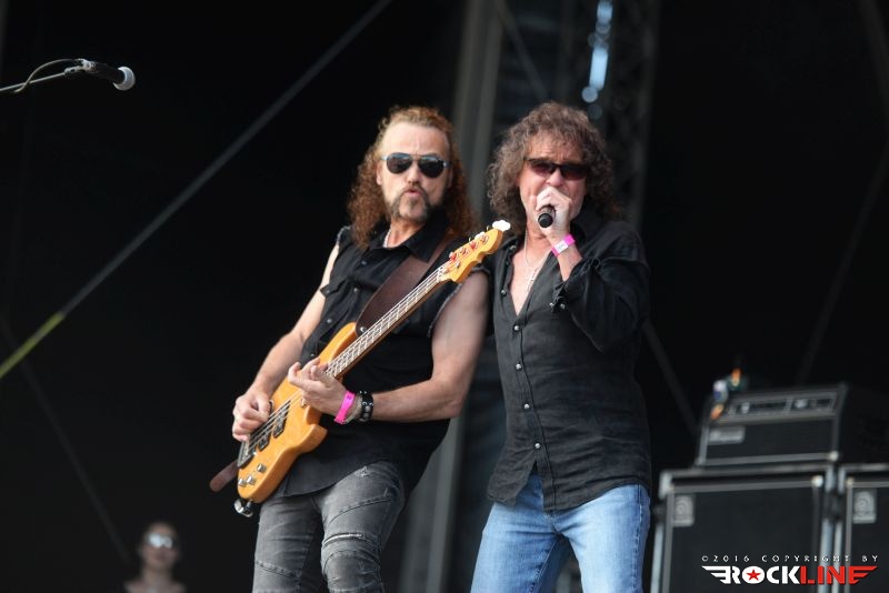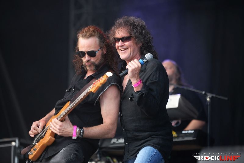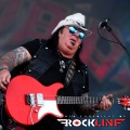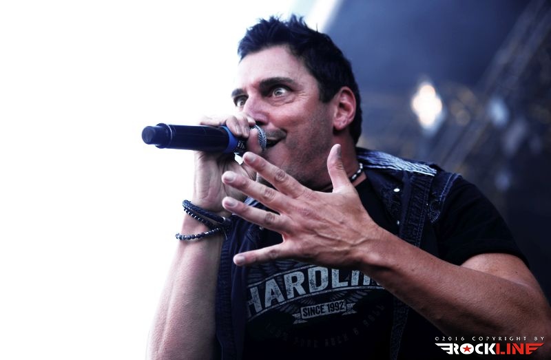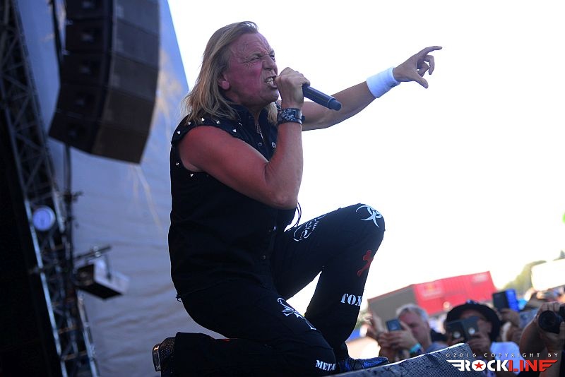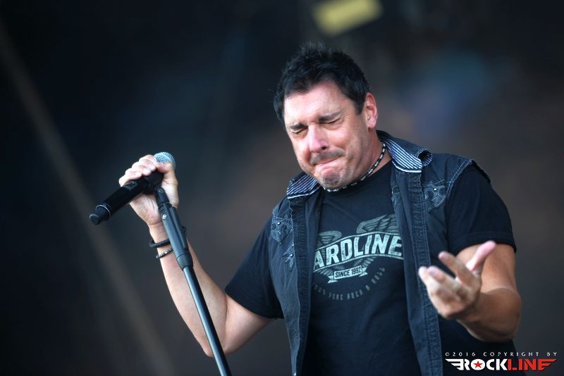Peti izvajalec drugega dne festivala je stopil na oder pet minut pred četrto popoldan. To so bili Hardline, ki jih zastopa izmed originalnih članov v novih časih le še pevec Johnny Gioeli. Zahvaljujoč njegovemu zagonu in entuzijazmu so Hardline sploh znova aktivni in so tako v obdobju med letoma 2009 in 2016 nanizali tri nove studijske albume med katerimi sta aktualni »Human Nature« in predhodnik »Danger Zone« več kot solidna, če ne kar zelo dobra. Bend je v novih časih zelo spremenjen kar se postave tiče. Na kitari se nahaja Portoričan Josh Ramos, ki je leta 2002 že ponudil Gioeliju usluge za Hardline album »II«. Za klaviature skrbi vsestranski Alessandro Del Vecchio, za bobni sedi aktualni Primal Fear bobnar Francesco Jovino, na bas kitari pa bi morala zaigrati Anna Portaluppi, ki pa jo je ob tej priložnosti zamenjal drug basist, katerega imena pa mi nikakor ni uspelo prestreči. Skratka. Bend je ob, izvedbi točk aktualnega abuma »Human Nature«, dostavil v veliki glavnini repertoarja izvedbo točk kultnega prvenca »Double Eclipse« (1992). Neverjetno, a skoraj ves omenjeni album so Hardline obdelali v slabi uri koncertnega nastopa. Zvrstile so se Dr. Love, Everything, Hot Cherie, I'll Be There, In the Hands of Time, Life's a Bitch, Rhythm from a Red Car, Takin' Me Down. Mokre sanje za ljubitelje tega albuma in skupine. Seveda ni šlo drugega pričakovati, kot novo izvrstno predstavo Johnnyja Gioelija, ki je bil tako kot lansko leto, ko je tu nastopal z Axlom Rudi Pellom, znova skrajno našpičen in je skakljal od enega do drugega člana skupine, kot krogla v »flipperju«. Ali je mož pred nastopom kaj požrl in kaj "počvakal" (ali ne), niti ni jasno, vendar pa ga je neverjetno trgalo in premetavalo skozi koncert. Pel je briljantno, kar je tudi bistvo. Le ena stvar je motila. Johnny ne obvladuje verzov. .No ko se je nekajkrat skorajda teatralno pričel obešati na stojalo mikrofona, z nogo an enem od monitorjev, je to postajalo na trenutke kar moteče, nakar je lahko vsak obiskovalec z malo več pozornosti brez večjih težav ugotovil, da pravzaprav škili v liste papirja nalepljene na tleh, ob stojalu mikrofona. Denarja za teleprompter, tako kot Judas Priest in Black Sabbath, Hardline pač nimajo. Dr. Love je bila že ena takšnih, »v verzih pozabljenih« točk. Sicer pa se tudi nad nastopom Hardline ni šlo pridušati prav v ničemer. Gre za vrhunske glasbenike, ki obkrožajo Johnnyja in ta koncert so pač oddelali z veliko odliko. Bend je v preostanku materiala preigraval tudi novi album in dostavil otvoritev koncerta z Where Will We Go From Here, v nadaljevanju pa izvedel še naslovno skladbo novega albuma ter Take You Home.