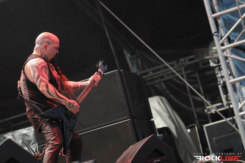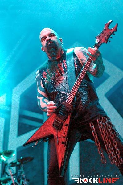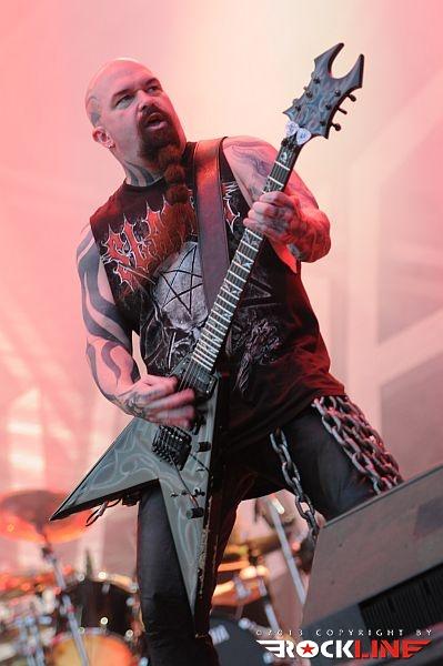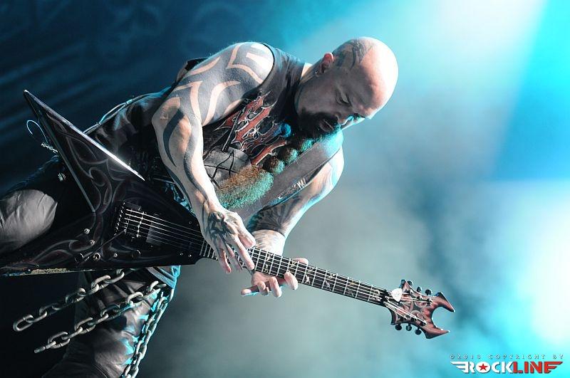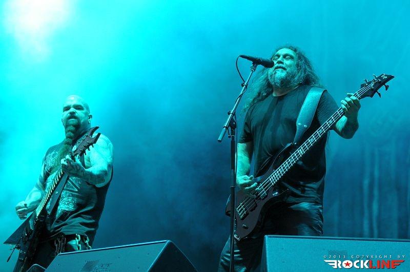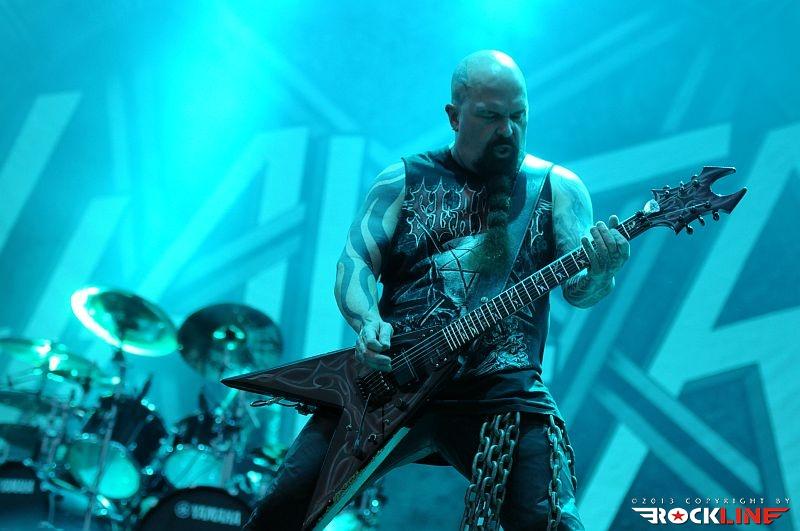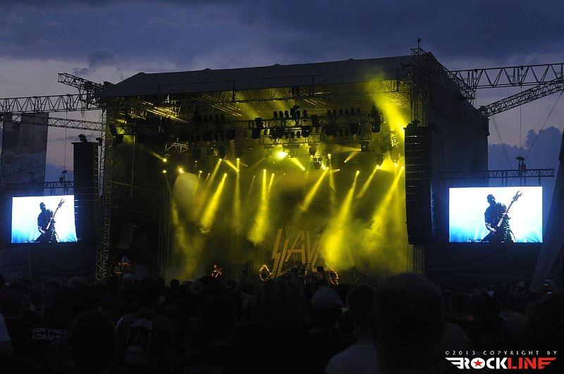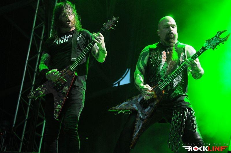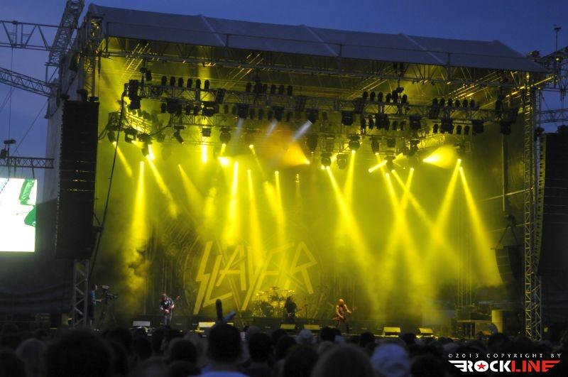 Slayer! Kultni ameriški thrash metalci, ranga »veliki štirje«. Skupina, ki jo v zadnjem času pesti pomanjkanje zdravja. Nedavno tega smo se vsi poslovili od tvorca Slayer biblije, tistega ki je prinesel vse najbolj pomembne riffe v komade – Jeffa Hannemana. Ob tej izgubi je skoraj nepomembno za skupino to, da nikakor ne more skleniti normalne komunikacije z bobnarjem Daveom Lombardom, ki jih je tako vnovič zapustil. Pred poletno turnejo skupine, je tako vskočil v postavo izkušeni Paul Bostaph (Exodus, Testament,..), medtem ko je Gary Holt (Exodus) preverjeni legionar, ki ga je skupina preizkusila prvikrat pred dvema letoma, ko Hanneman ni mogel več igrati kitare, zaradi zastrupitve roke z mesojedo bakterijo (posledica strupenega pajkovega ugriza). Slayer, pa so uprizorili reakcijo »ranjenega leva«. Torej so odigrali koncert na vse ali nič. Brez zadrževanja, brez premišljenega taktiziranja. Le šus na polno. Podivjani Kerry King, karizma brez primere, ki je po novem nekaj kil očitno doniral porejenemu in osivelemu frontmanu skupine Tomu Arayi, ohranja videz nepokorščine in izrazite zagrizenosti. Glede na njegovo čokato držo, preseneča izredna agilnost in odrska dinamika kitarista, ki se je med koncertom nekajkrat z ramo ob rami pridružil Holtu na njegovi desni. Za razliko od Kinga, se Holt ne sme premakniti mnogo proti sredini odru, ko zavzema svojo skrajno levo pozicijo (gledano na oder). Tak je interni dogovor v skupini, Holt pa nosi še vedno za Slayer le vlogo najetega plačanca.