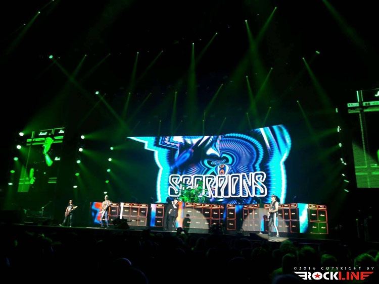 Zastor je padel in ob močni avdiovizualni podpori na velikem odrskem zaslonu je na oder pritekla peterica ter nastop otvorila s skladbo novejšega emša Going Out With a Bang. Scorpions so sinonim za številne v rockerskem svetu ponarodele klasike, tako da so jih lahko v enakomernem tempu servirali skozi celotno dolžino druženja. Že v uvodu so Nemci tudi tribune na noge dvignili z nesmrtnima Make It Real ter The Zoo. Dva stalna člana skupine sicer nista nemškega porekla, basist Pawel Mąciwoda je poljskega, zadnji pridruženi član, bobnar Mikkey Dee, pa švedsko-grškega izvora.
