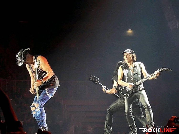 V daljših inštrumentalnih preigravanjih, kakršen je denimo celoten komad Coast to Coast, so Scorpionsi pridno izkoriščali podaljšan oder, tako imenovani »cat walk«, ki je v sprednjem delu parter prerezal na dvoje. Kitarski dvojec Rudolf Schenekr / Matthias Jabs je pridno nabiral odrsko metražo in preigraval zdaj na eni, zdaj na drugi strani. Kljub letom in posledično gubastim obrazom, ki so jih skrbno skrivali pod čepicami in za sončnimi očali, smisla za humor niso izgubili! Schenker je pridno razmetaval kitarske trzalice in z obrazno mimiko iskal kontakt s publiko v sprednjih vrstah, šaljive poteze izkušenega in cenjenega kitarista imajo v odrski pojavi Scorpionsov pomembno vlogo.