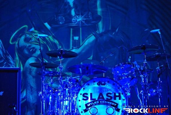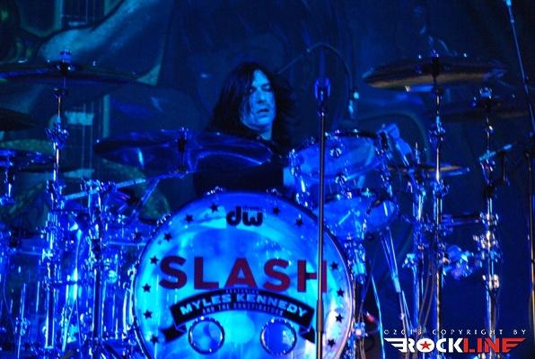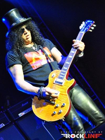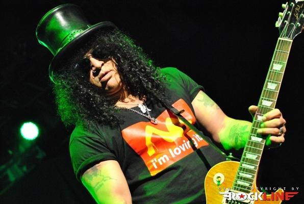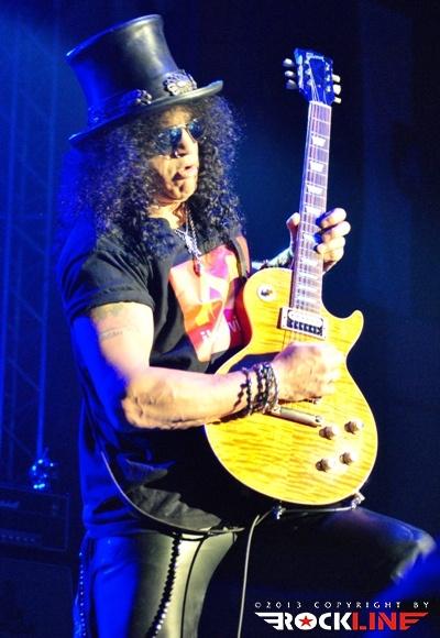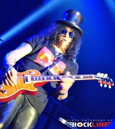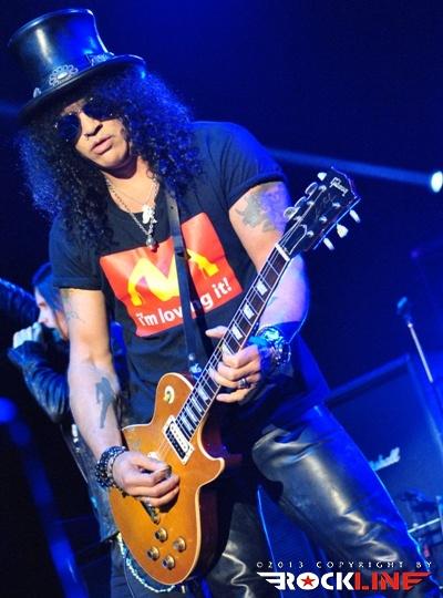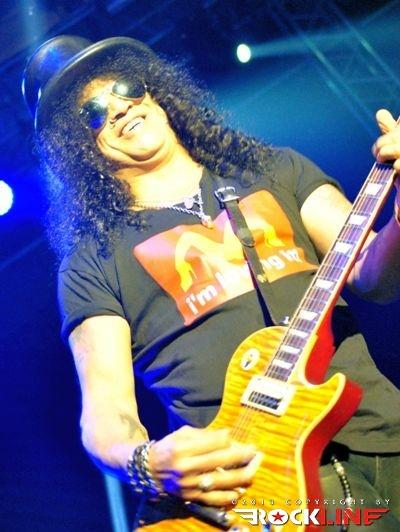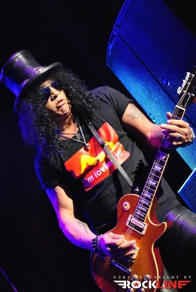 Slash je večino časa oddelal na desni strani odra. Bil je spokojen, pogled na njegov obraz so zastirala bleščeča sončna očala in skrivala razpoloženjske grimase. Vrhunci koncerta so bile njegove solaže, ki so k sreči kljubovale akustiki tivolske dvorane in na navdušenje množice odzvenele v polno! Povsem drugače je bilo z zvočno umestitvijo ritem sekcije, sploh v prvem delu koncerta, saj zvok bobnov in basa ni našel optimalnega prostora v celostni sliki, zato je iz zvočnikov mestoma prav moteče zarožljalo, v tem oziru je bil uvod v komad Civil War prava mala polomija. Čeprav na prvi pogled hladen kot špricer, je Slash ves čas budno spremljal in diktiral potek koncerta. Mojstrstvo svoje riff retorike je uspešno predstavil v intru komada No More Heroes, tudi sicer pa je z vihtenjem prstov po vratu kitare nase stalno privabljal soje žarometov. V poskočnem komadu Doctor Alibi se je v vlogi vokalista posrečeno predstavil basist Todd Kerns in tako vsaj za trenutek stopil iz sence prvih dveh imen koncerta, Slasha in Mylesa Kennedyja.