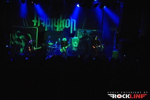 Pod večnim vodstvom jeklenega vodje Toma G. Warriorja At the Gates na turneji spremljajo Triptykon, kar je bil še dodaten razlog za obisk koncerta, saj je tudi njihov letošnji album Melana Chasmata ena najmarkantnejših izdaj letošnjega leta. Triptykon so, blaženemu božičnemu času v čast, za uvodni komad izbrali enajst minutni poklon Princu teme Goetia. Zvočniki Arene so bili Triptykon naklonjeni in resnično je do izraza prišla rušilna narava relativno preprostih rifov, ki pa kljub temu meljejo vse pred seboj, ter grozeč grleni Tomov krulež z obveznimi, že ponarodelim medmeti »Ugh!« Nekoliko je tokrat presenetila ali morebiti celo razočarala setlista, saj je levji delež za Triptykon odmerjenega časa padel na več kot deset minutni Goetia in The Prolonging. Res je, da so Tom in ostali osrečili z večnima Celtic Frost himnama Circle of the Tyrants in The Usurper, a je zmanjkalo časa za predstavitev aktualne plošče, ki je polna odličnih rušilcev. Tako bi namesto Altar of Deceit veliko bolj prijala na primer Boleskine House, Breathing ali Aurorae. Zmotila je tudi Tomova komunikacija v nemščini in nekoliko preveč statičen nastop celega benda, a kljub temu so Triptykon uspeli za slabo uro Areno zaviti v debel ovoj teme, bolečine, obupa in Gigerjevske groze.