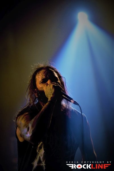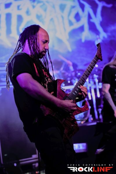 No in nastop skupine, ki je privabil največ pozornosti tega večera, ameriške legende tehničnega death metal pinorstva Suffocation. Ljudi se je nagnetlo dobrih tristo. Konkretno naukrjenih in nazobčanih. Temperaturo so dvigovali tudi nekateri ljubitelji težkih zvokov, ki so prispeli iz sosednje Hrvaške, bilo je tudi nekaj »izgubljenih in pozabljenih« Slovencev (to zato, ker vedno potujemo ločeno na koncerte v tujino) iz Štajerskega konca. Bend je dostavil nov vrhunski nastop v katerem je seveda pristopil v igri na polno in streljal z vso razpoložljivo artilerijo in z vseh položajev. Glede na to da je Frank Mullen, prvo grlo skupine, pred dnevi obrazložil, da zaradi službenih obvez zapušča Suffocaiton trajno, se pravi za nedoločen čas , se sedaj odpira vprašanje ali bo skupina na njegovo mesto integrirala kar dosedanjega občasnega koncertnega pomagača, ki je vstopil v četrto leto tovrstnega službovanja pri Suffocation. To je sicer bobnar skupne Disgorge Ricky Myers, ki je tudi tokrat dostavil s svojim prodornim growlom silno zgledno predstavo, vredno tega, da nosi Mullenove škornje. Bend se izjemno dobro drži ne glede na to, da je šel v zadnjem času skozi lep sveženj pretresov v postavi. To je potrdilo znova tudi izredno bobnarsko znanje in predstava novinca Erica Morottija, ki se je skupini priključil pred dvema letoma, kot zamenjava za izjemnega in v marsičem težko zamenljivega virtuoza »na kožah« Mikea Smitha. Če gremo v tej maniri dalje je v ekipi še en precej svež član. To je Charles Errigo, ki je prav tako sprva služboval pri skupini, kot začasna zamenjava za preobremenjenega Guya Marchaisa, a so ga pred kratkim fantje priključili k redni postavi skupine. Tako je ob edinem originalnem članu skupine Terence Hobbsu, ki je seveda s Suffoation preživel vse hude in dobre čase, basist Derek Boyer, ki drgne bas kitaro pri Suffocation od leta 2004 dalje. Bend je v lanskem juniju izdal svoj skupno osmi studijski album »…Of the Dark Light«, s katerega je predstavil dve skladbi Return to the Abyss in Clarity Through Deprivation, ki skupaj z ne mnogo starejšo Pinnacle of Bedlam s prejšnjega albuma, uspešno vzdržuje visoko kakovostno reputacijo in razvpitost, ki jo je skupina zavoljo svoje komponistične širine ekstremnih tehnično kompleksnih brutalnih razgledov, prigarala skozi leta in jo uživa pri svojih fenih tudi na zrela leta delovanja.